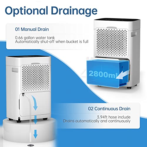• 【Water Full Alert & Dual Drainage Options】The 2.8L water tank includes an automatic shut-off and indicator light to prevent overflow. For extended operation, connect the included 3.94ft hose for continuous drainage. This dehumidifier for basement with drain hose is perfect for unattended use and large-space moisture management.